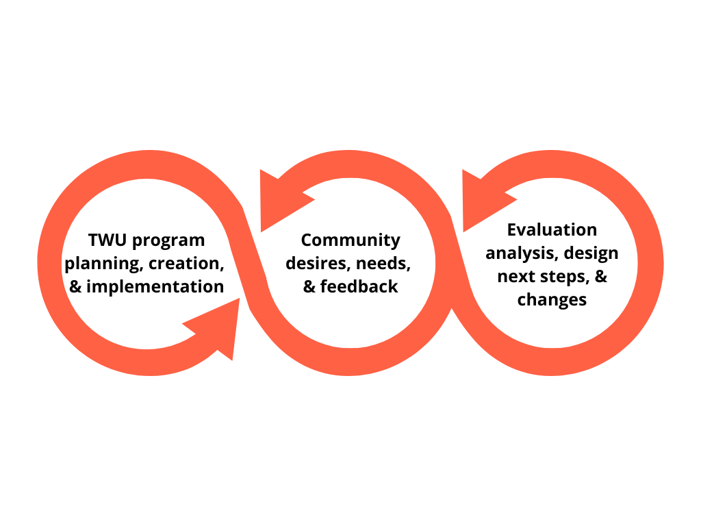Talking Circles + Focus Groups Group conversations based around connection and inquiry into experiences of TWU programs, community needs, etc. To build and strengthen community relationships, gather qualitative data on TWU and programs